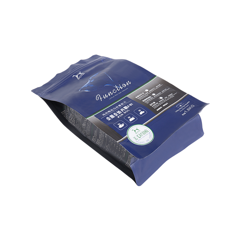 Le sac de nourriture pour chien scellé à huit côtés adopte une structure d'étanchéité tridimensionnelle à huit côtés, avec une forme carrée et des bords et des coins clairs, ce qui améliore la résistance à la compression et la stabilité d'empilage. Il utilise des matériaux composites à haute résistance (tels que PET/AL/PE) pour empêcher l'humidité, l'oxygène et la lumière, bloquant ainsi efficacement la fraîcheur. Le dessus est conçu avec un joint facile à déchirer ou à fermeture éclair pour une ouverture et une fermeture faciles et une fermeture répétée. Les nervures de renfort latérales améliorent la capacité de charge et le fond large tient fermement. La surface peut être imprimée avec des couleurs de haute précision et une fenêtre transparente peut être utilisée pour afficher le contenu. Il convient aux emballages de grande capacité de 5 à 20 kg, alliant durabilité et commodité pour répondre aux besoins de conservation à long terme des aliments pour animaux de compagnie.